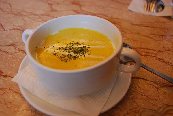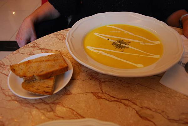 這次點了一份套餐和單點濃湯麵包,套餐本身除了主菜外會附贈一碗湯,一杯飲料和甜點一份
